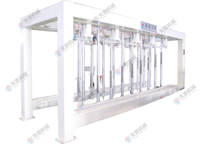 脫模后的坯體連同側(cè)板一起放置在切割小車上,切割小車由減速電機(jī)驅(qū)動(dòng)行走,通過(guò)縱向切割機(jī)完成縱向切割,切割小車?yán)^續(xù)行走至橫向 切割機(jī)中間位置停止后,由小車置換裝置將側(cè)板連同坯體抬起,切割小車退回翻轉(zhuǎn)行車底下進(jìn)行下一次承載脫模后的坯體,另外一部切割小車 進(jìn)入置換裝置底下后, 置換裝置將側(cè)板連同坯體放置該切割小車上后,橫向切割動(dòng)作后啟動(dòng)進(jìn)行橫向切割動(dòng)作,切割完成后,切割小車再行走至確地行車底下,再由 翻轉(zhuǎn)去底行車將坯體去底(連側(cè)板)吊至蒸養(yǎng)小車上,切割小車范圍原始位置進(jìn)行下一個(gè)切割循環(huán)。