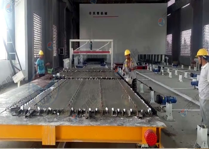 PC環(huán)形疊合板/內(nèi)墻板生產(chǎn)線(xiàn)的主要設(shè)備包括雙梁橋式起重機(jī)、清理機(jī)、脫模劑噴涂機(jī)、布料機(jī)、振動(dòng)臺(tái)、趕平機(jī)、拉毛裝置、預(yù)養(yǎng)窯、抹光機(jī)、碼垛車(chē)、養(yǎng)護(hù)窯、翻轉(zhuǎn)機(jī)、擺渡車(chē)、支撐滾輪、驅(qū)動(dòng)輪、模臺(tái)和成品運(yùn)輸車(chē)等。